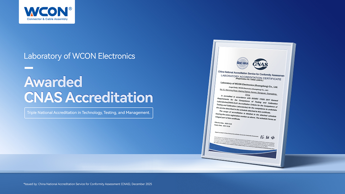 El 29 de diciembre de 2025, WCON Electronics Co., Ltd. recibió formalmente el Certificado de Acreditación de Laboratorio CNAS por parte del Servicio Nacional de Acreditación de Evaluación de la Conformidad de China (CNAS). Esto significa que el centro de pruebas y experimentos establecido de forma independiente por WCON Electronics ha alcanzado reconocimiento nacional por sus capacidades técnicas, estándares de gestión y fiabilidad de sus resultados de prueba, demostrando que su sistema de gestión de calidad está ahora alineado con los estándares internacionales.